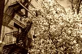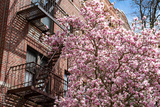 Beautiful Pink Magnolia Flowering Tree during Spring next to a Fire Escape on an Apartment Building in Astoria Queens New York