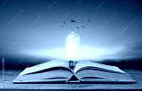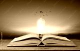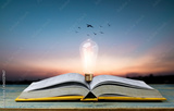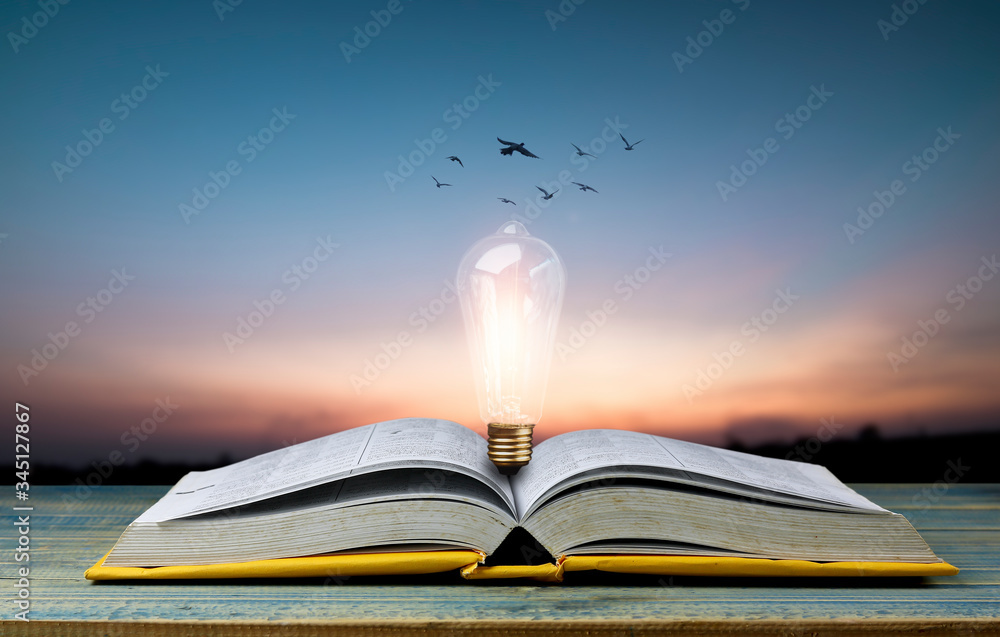 open book with light bulb on table and bird flying on sky, knowledge and wisdom concept