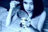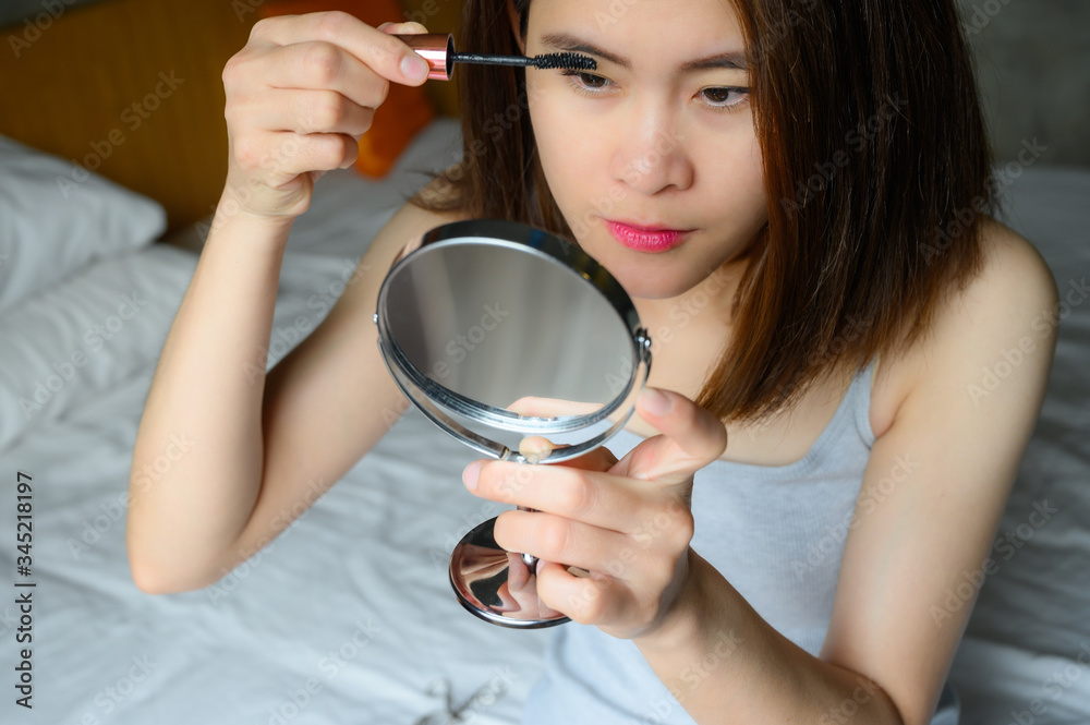 Portrait of young Asian woman applying black mascara on her eyelashes with a wand applicator. Mascara is a cosmetic commonly used to enhance the eyelashes.