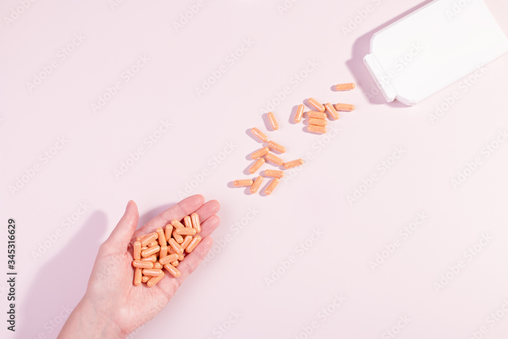 Woman taking vitamins and supplements. Orange vitamin capsules or pills in woman hand pouring from white bottle. Healthy lifestyle, top view, pastel background