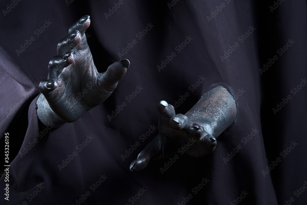 two beautiful man's hands in silver paint on a black background