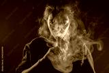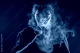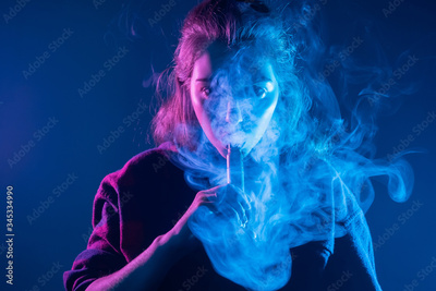 Smoking an electronic cigarette. The girl's face is covered with smoke from vape. Portrait of a female smoker in a cloud of smoke. A woman smokes a VAPE on a dark background.