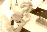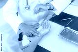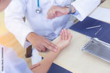 Doctor check patience's pulse by fingers, touch patients wrist. Doctor look at wristwatch, medical checking on doctors table in doctor office at medical clinic. General doctor care patient. healthcare