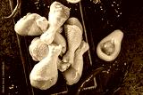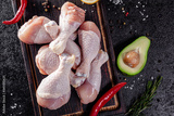 Raw meat. Chicken legs lie on a wooden board with vegetables and spices on a black background. background image, copy space text