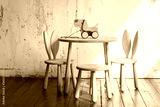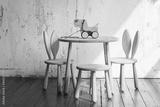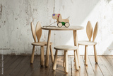 Photo of a wooden dog on wheels of beech on table.A toy for entertaining children and resting parents
