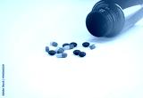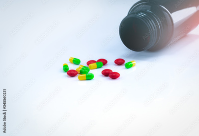 Red tablets and green-yellow capsule pills with amber plastic bottle on white table. Pharmaceutics concept. Pharmaceutical industry. Pharmacy products. Healthcare and medications. Drug interactions.