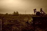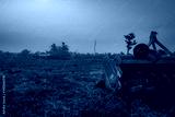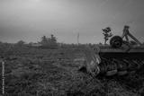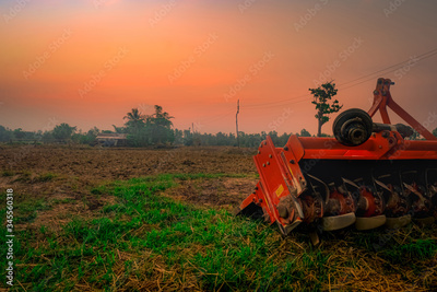 Ridging crackdown machine. Supply for tractor. Agricultural machinery in agriculture farm. Rice farm in morning with red sunrise sky. Nature of farmland. Farmer hut and electric pole in farmland.