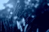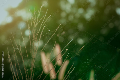 Grass flower with spider web in the morning. Closeup grass flower with blurred green bokeh background. Grass field in the forest with sunlight. Summer time in countryside. Cobweb in wild.