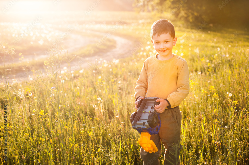 little boy with toy car on field spring warm, evening light, childhood illustrations