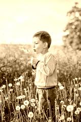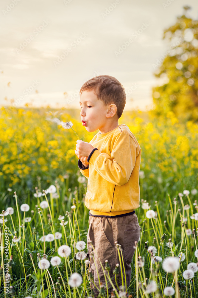 little boy blowing on dandelions in spring near yellow rapeseed field, warm evening light
