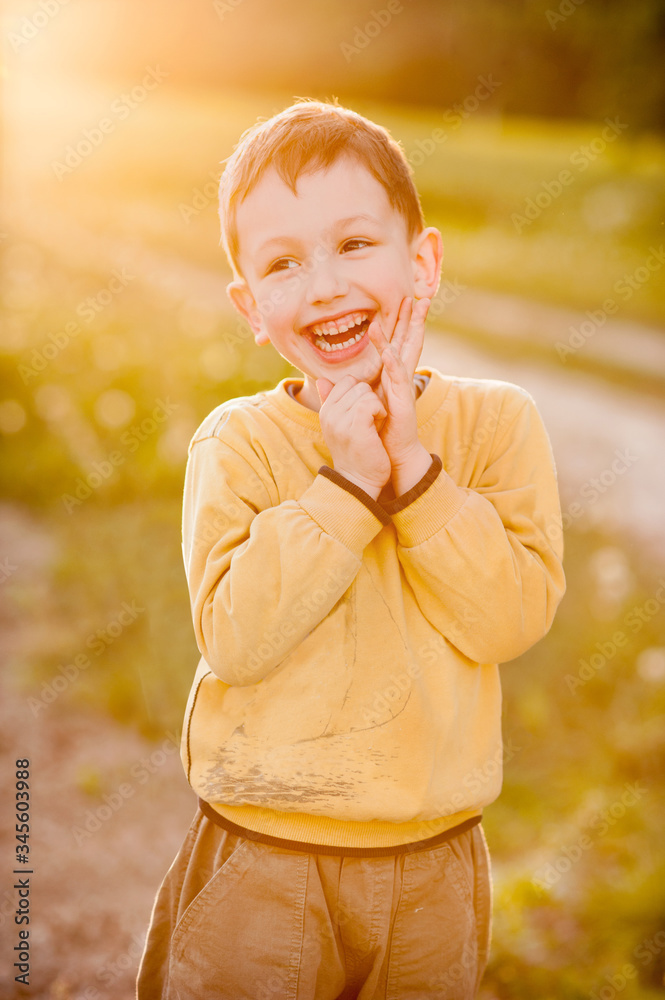 Happy childhood, little boy laughs, dressed yellow sweatshirt, warm evening light