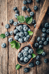 Blueberries in wooden spoon on old wood background. Healthy eating and nutrition concept.