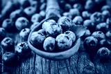 Blueberries in wooden spoon on old wood background. Healthy eating and nutrition concept.