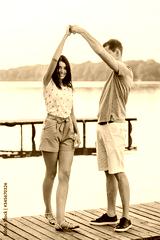 Loving young couple dancing on pier at sunset in summer.
