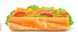 Submarine sandwich with ham, cheese, tomato, lettuce salad isolated on white. Homemade baguette ham sandwich with vegetables. Large sub tomato sandwich closeup, banner