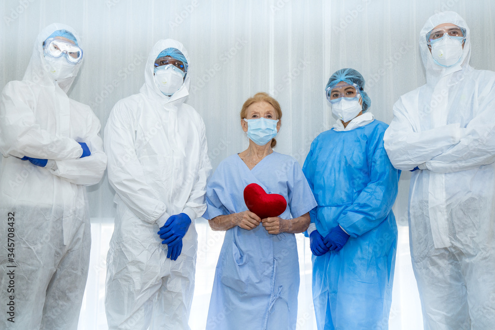 Victory of Doctor & nurse team just recovered patient in hospital. Recovering patient and medical team win virus Covid-19 outbreak. Health Insurance, happy patient, teamwork Raise hand sucess concept
