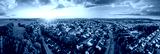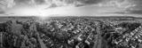 Aerial panorama of a small town at sunrise, with magnificent colorful sky and warm light