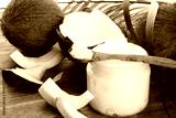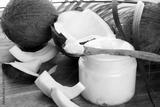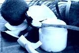 Coconut oil with fresh nut and palm leaves on rustic background.