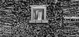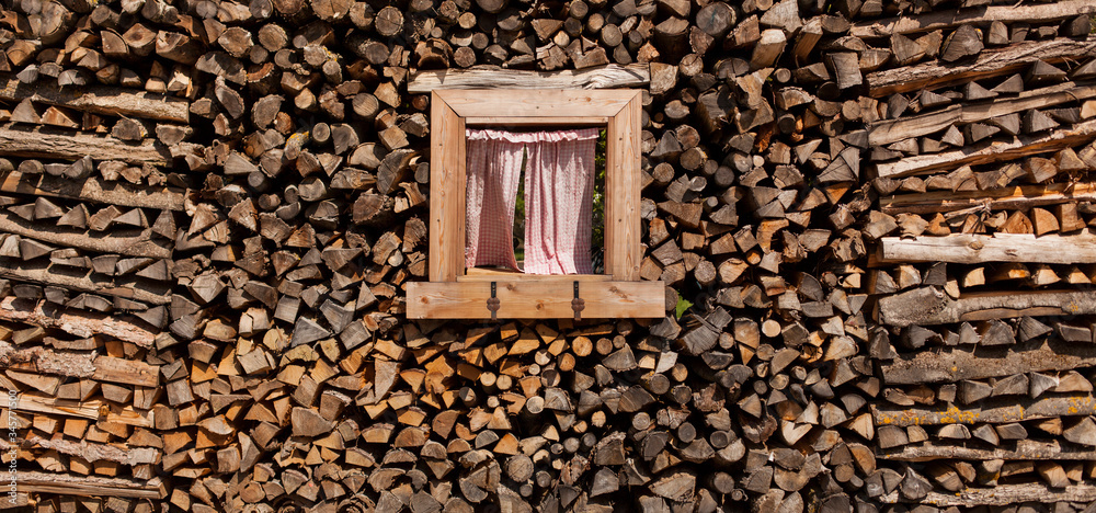 Fenster in Holzstapel. Holzfenster eingebaut in Holzfassade. Fenster, Kunst, Projekt. Window in stack of wood. Wooden window built into the wooden facade. window, art, project