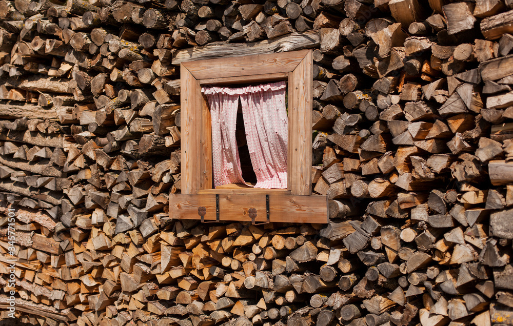 Fenster in Holzstapel. Holzfenster eingebaut in Holzfassade. Fenster, Kunst, Projekt. Window in stack of wood. Wooden window built into the wooden facade. window, art, project