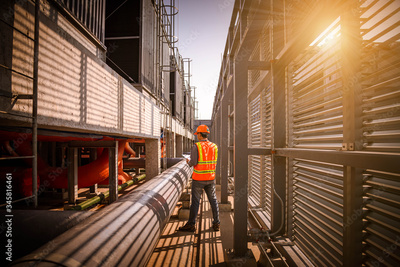 A engineer under checking the industry cooling tower air conditioner is water cooling tower air chiller HVAC of large industrial building to control air system.