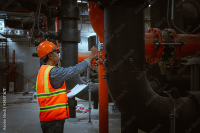 A engineer under checking the industry cooling tower air conditioner is water cooling tower air chiller HVAC of large industrial building to control air system.