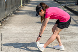 Portrait of runner woman doing stretching and warming up her legs before running in the public park. The benifit of stretching can increasing flexibility and reduce injury.