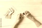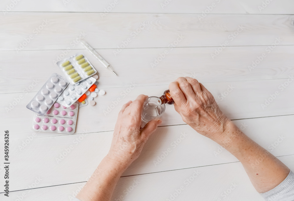 Senior hands with medicine bottle putting drops in a glass, pills, drugs, thermometer on a table. Woman wrinkled hands, colorful tablets, wooden background. Health care for the elderly, old age.