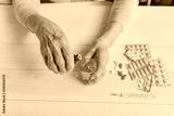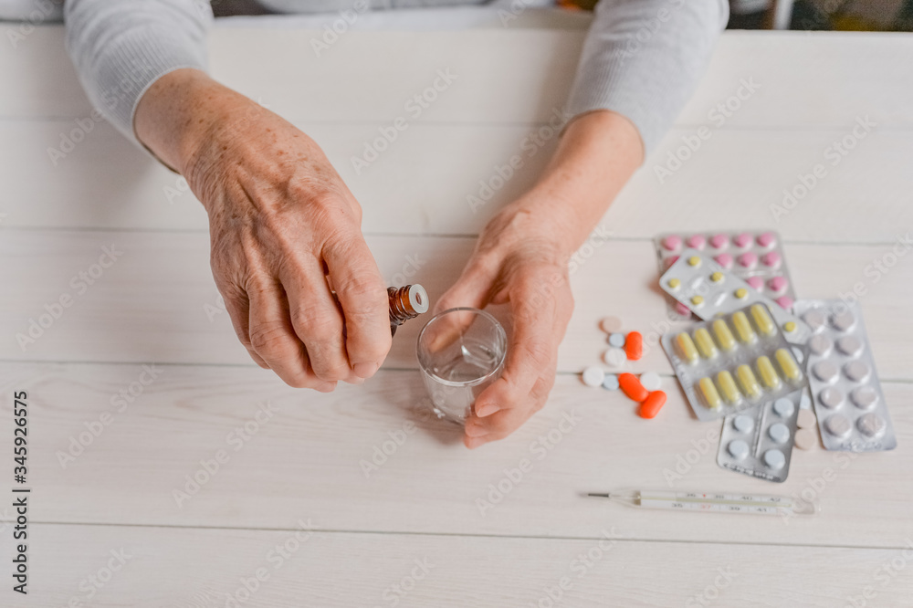 Senior hands with medicine bottle putting drops in a glass, pills, drugs, thermometer on a table. Woman wrinkled hands, colorful tablets, wooden background. Health care for the elderly, old age.