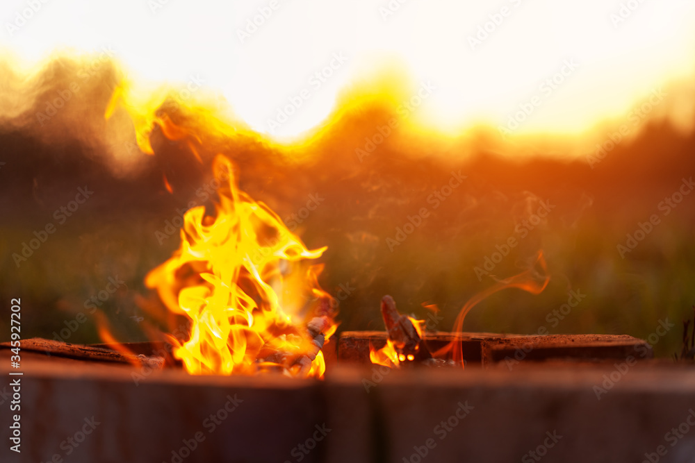 Bonfire on sunset nature background. Outdoor wood campfire