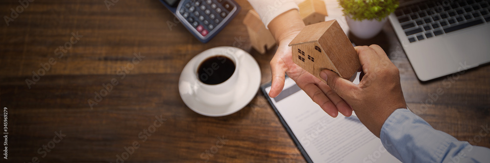 Business Bank agency holding house model and give proposal to customer, housing loan in cheap interest for buying home and condominium finished contract of real estate concept.