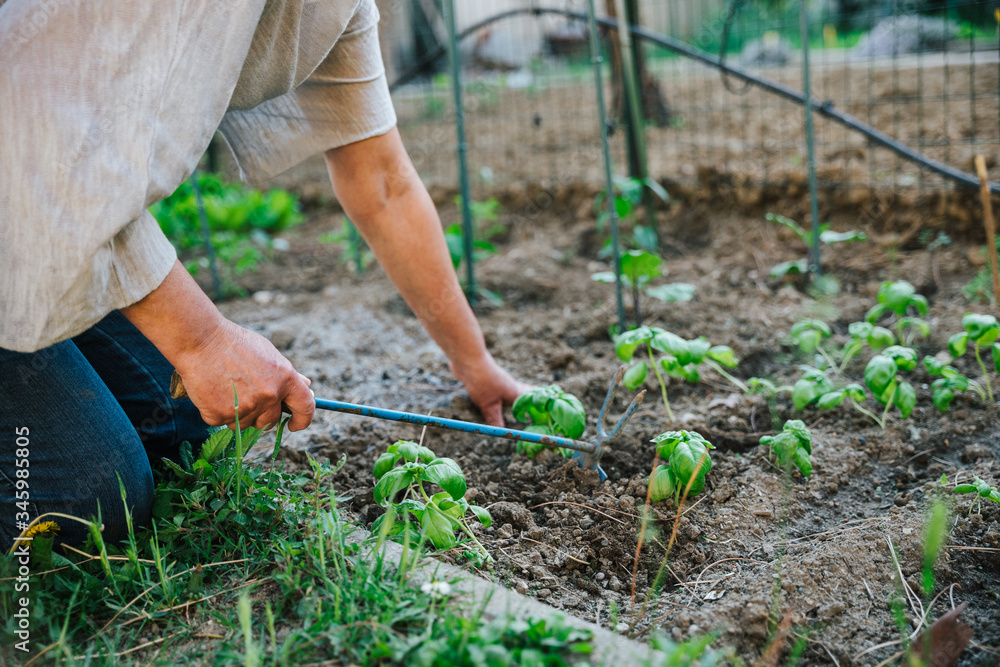 Friendly adult woman works the land with a tool for planting new plants in the home garden - Female digs in social urban spaces - Concept of ecological and sustainable