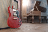 Red electric guitar in a beautiful old room