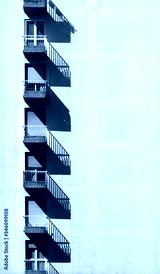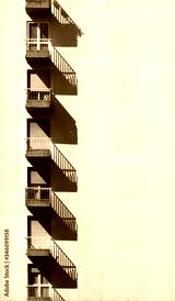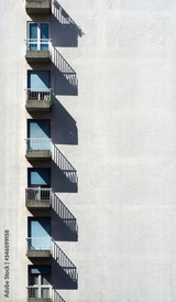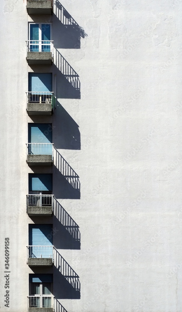 A row of balconies arranged vertically on a whitewashed facade. Architectural background.