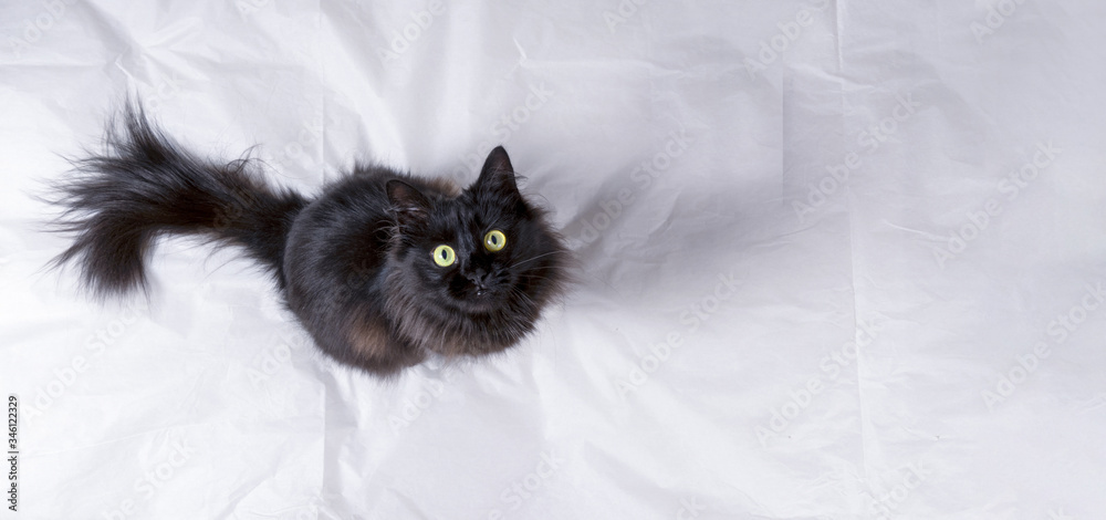 black cat sits on a white surface and looks up, top view