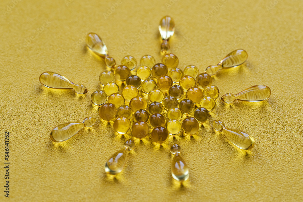 Pharmaceutical medicine tablets, capsules with vitamin D on a bright yellow background.