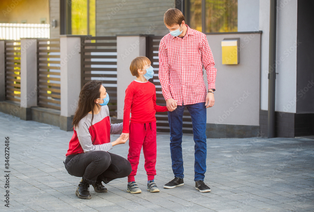 Coronavirus quarantine. Family going walk. Coronavirus, illness, infection, quarantine, medical masks. Parents and kid wearing a surgical mask. Air pollution concept. Prevention coronavirus