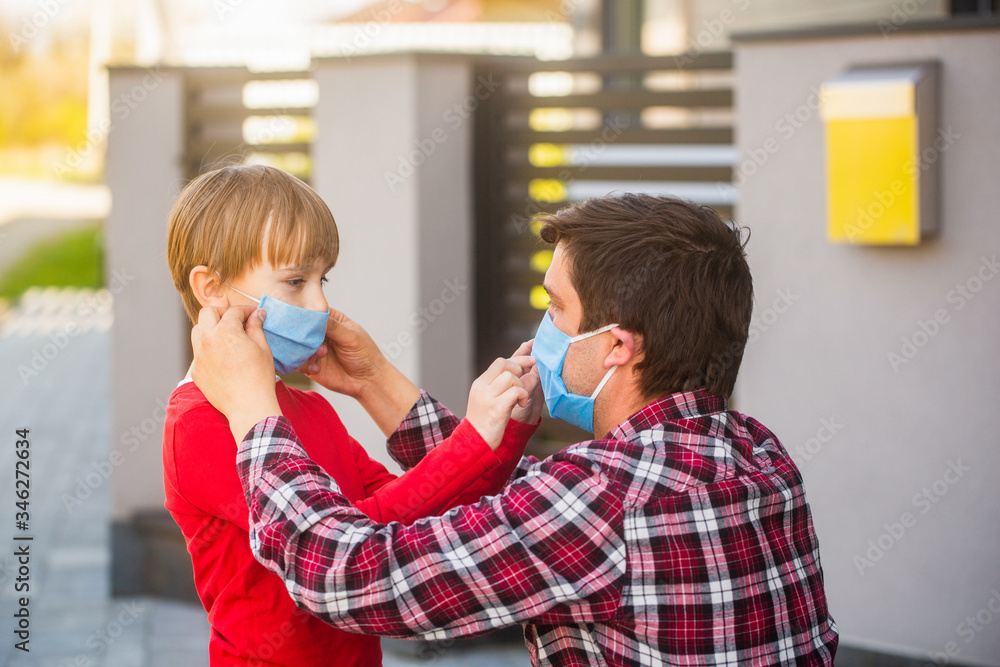 Family wearing face mask for protection during the quarantine. Father puts on son medical face mask outdoors. Coronavirus quarantine. Coronavirus epidemic, virus symptoms