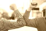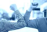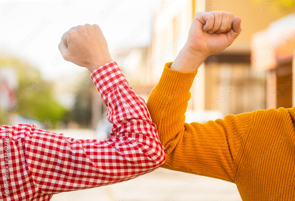 Friends demonstrating a new way of greeting during coronavirus epidemic. Health care concept. Social distancing. Two people bump elbows to avoid coronavirus outdoors