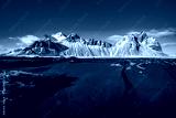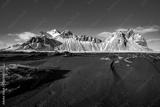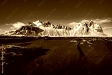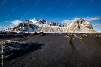 Vestrahorn in late afternoon light, covered in snow with black sand in the foreground.