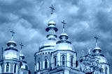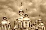 Clouds surround St Michaels in Kiev classic golden cupolas of the cathedral.
