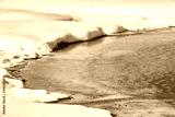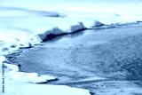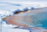 Colorful thermal pool surrounded by snow in Yellowstone in winter.