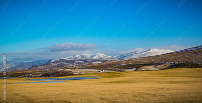 Icelandic farmland in the North West corner of the cointry with snow capped mountains