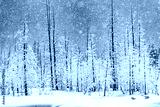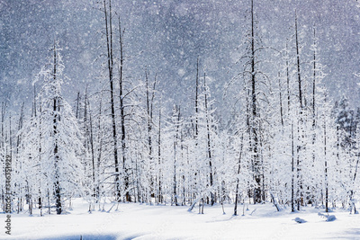 Pine trees covered in snow with blue sky