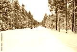 Row of snowmobilers cross Highway 20 in winter in Yellowstone