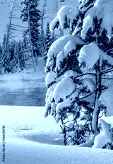 Snow laden pine tree stands in deep snow in Yellowstone.