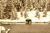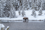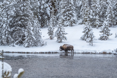 Snowy winter scene in Yellowstone with pine trees, river and bison.