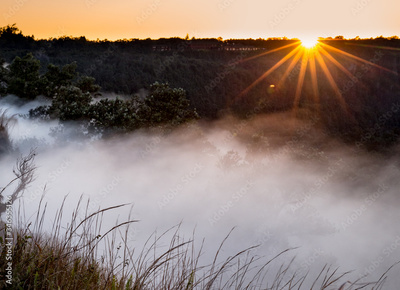 Sun rises over Steaming bluff overlook in Kilauea Crater.CR2