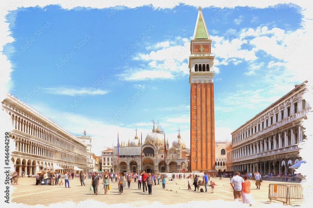 Piazza San Marco. Imitation of a picture. Oil paint. Illustration. City Venice