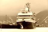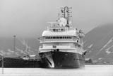 Passenger ship moored in port of Longyearbyen view from forward